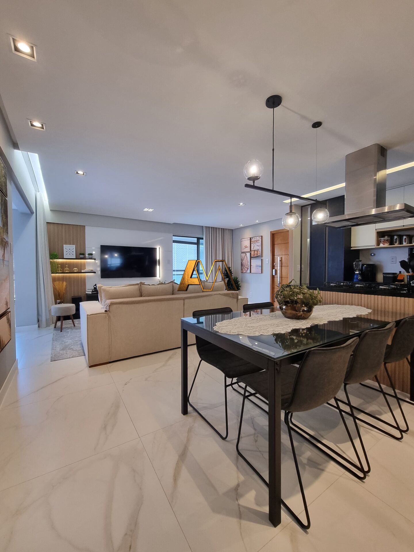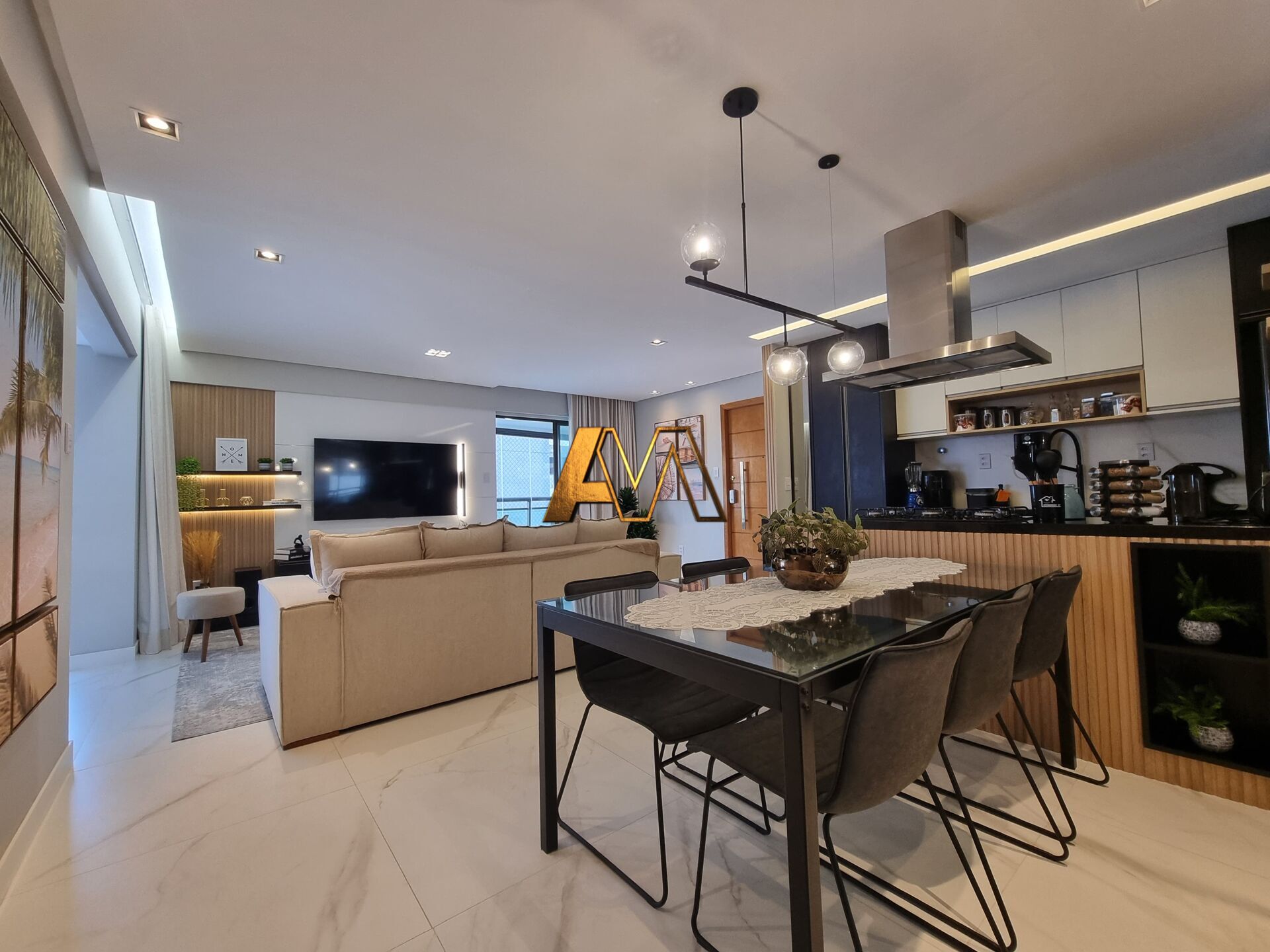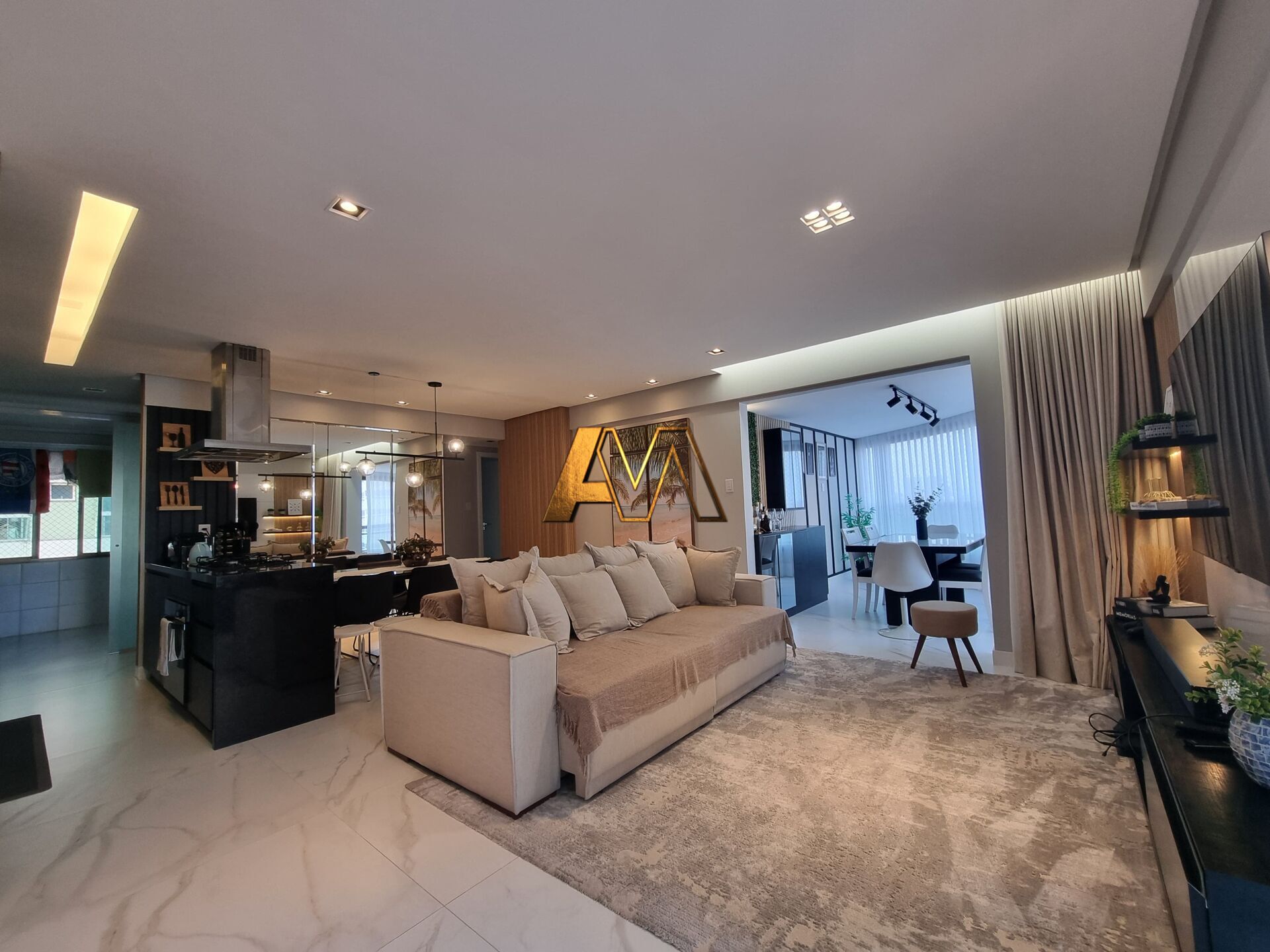 Sala ampla com porcelanato 90x90 e varanda integrada