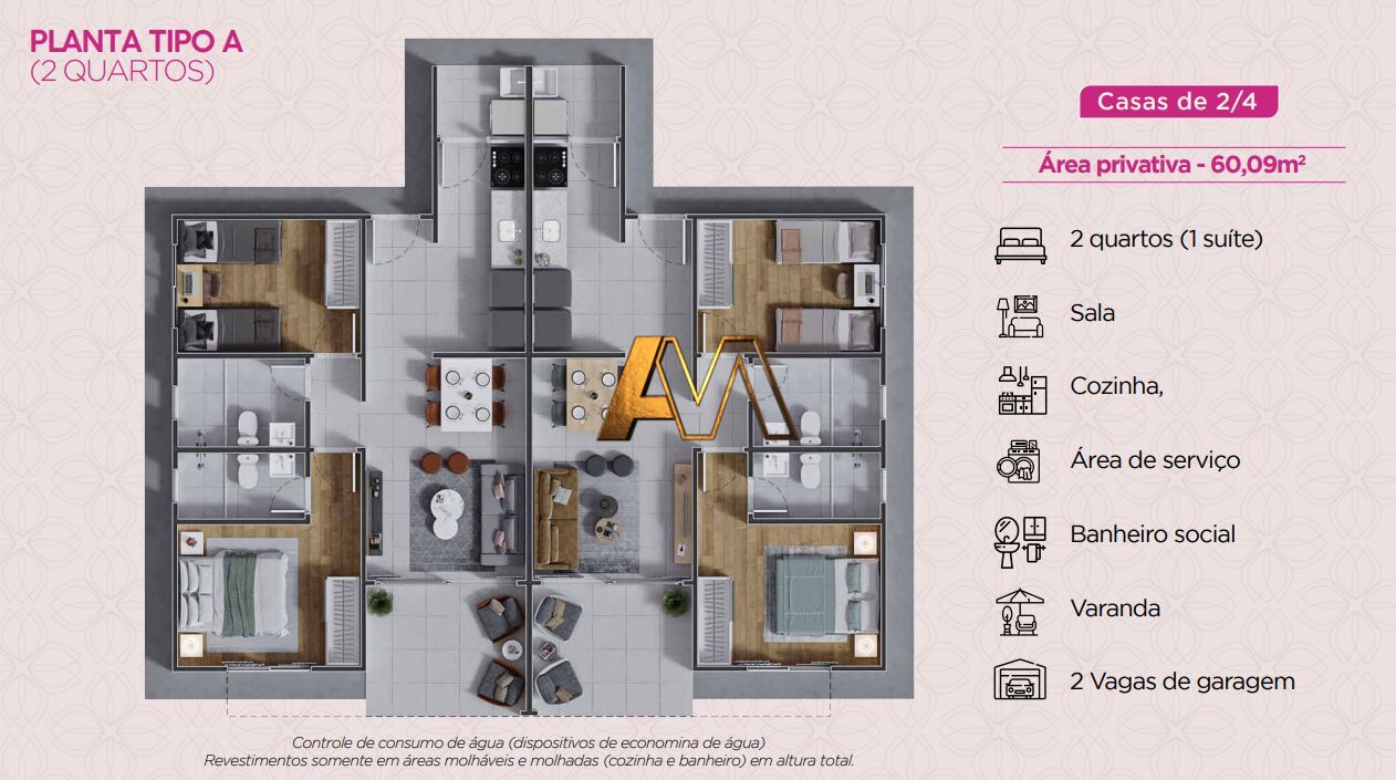 - 2 quartos, sendo 1 suíte, com planta inteligente e funcional.