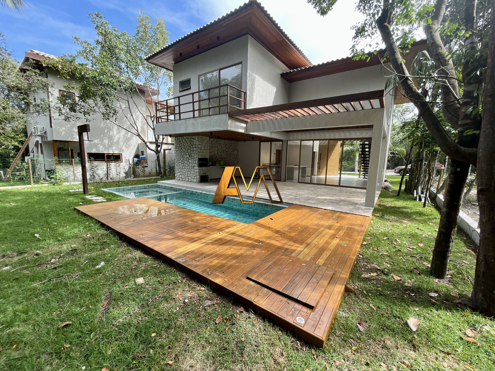 Casa com terreno de 450m2 e 220m² de area construida, 4 suítes , suite master com varanda closet e 2 pias e 2 chuveiros, sala com pé direito duplo, cozinha com ilha, lavabo, dependência, área de serviço, sanitário piscina, esquadrias em alumínio, porta primcipal com 6m e fechadura eletrônica, entregue com todas as louças, metais e luminárias internas e externas, bancadas esculpidas em granito, área verde, depósito, 2 vagas de garagem com pergolado.