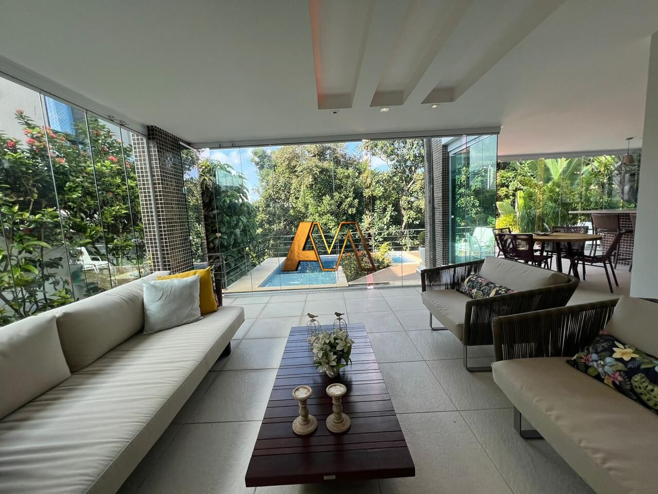 Com 4 suítes, sala de estar ampla, sala de TV climatizada, cozinha com armários planejados, área gourmet completa, piscina, varanda, jardim, 2 lavabos, área de serviço, 5 vagas de garagem, porcelanato, closet, ar condicionado.