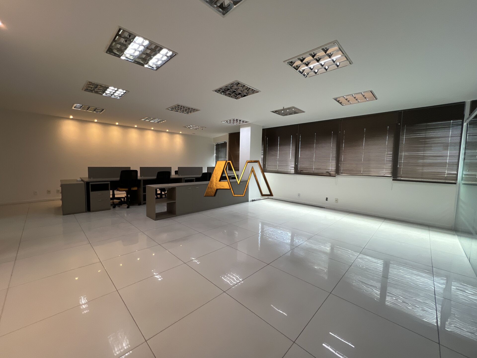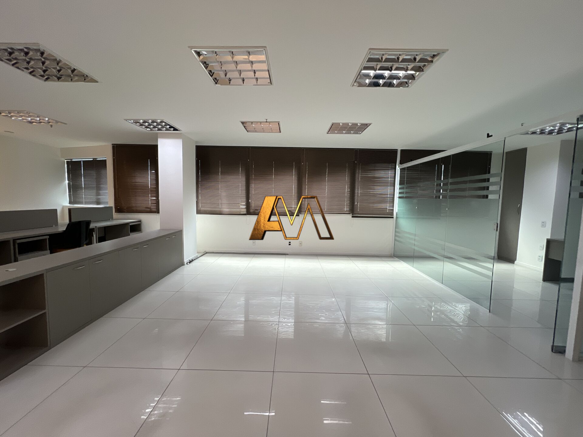 - Layout Moderno: Espaço amplo com sala tipo "aquário" em vidro e persianas instaladas.